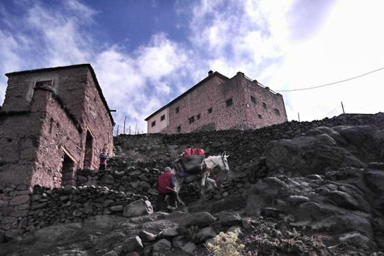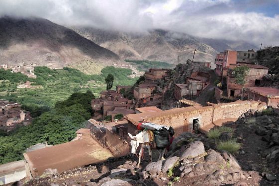 Nach einem schnellen Frühstück in unserem Riad geht es um halb 9 los: Brahim, unser netter und super englisch sprechender Bergführer holt uns ab und führt uns durch die noch leeren Strassen der Medina von Marrakech zu einem Geländewagen, in dessen Inneren der Fahrer ein genüssliches Schläfchen hält. Fahrer geweckt, Gepäck und Insassen im Wagen verstaut und ab geht die Fahrt in Richtung Atlasgebirge. Die Landschaft wird Stück für Stück immer bergiger, Dörfchen und Menschen, die mit allen vorstellbaren Arten von Bewegungsmittel unterwegs sind ziehen an uns vorbei, es wird merklich kälter, je höher wir kommen. 8 Grad zeigt das Thermometer als wir schließlich in Imlil aus dem Auto steigen. Ca. 15 Grad weniger als in Marrakesch. Freundlich werden wir vom Inhaber unserer Trekkingfirma begrüßt und bekommen erst einmal einen marokkanischem Pfefferminztee eingeschenkt. Lecker und super zum Aufwärmen. Dann werden Ruckzuck unsere Siebensachen auf ein bereitstehendes Maultier geschnürt und los geht es.