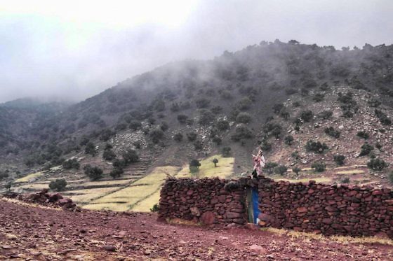 Eigentlich wäre auf dem Tizi Mzik Pass auch unser Lunchstop, doch aufgrund des Regens ist unser Maultierführer bereits zu unserem Tagesziel, Tizi Oussem Village, vorausgegangen. Wir machen uns auf den Abstieg, immer tiefer in die Nebelschwaden hinein. Der Regen stoppt.