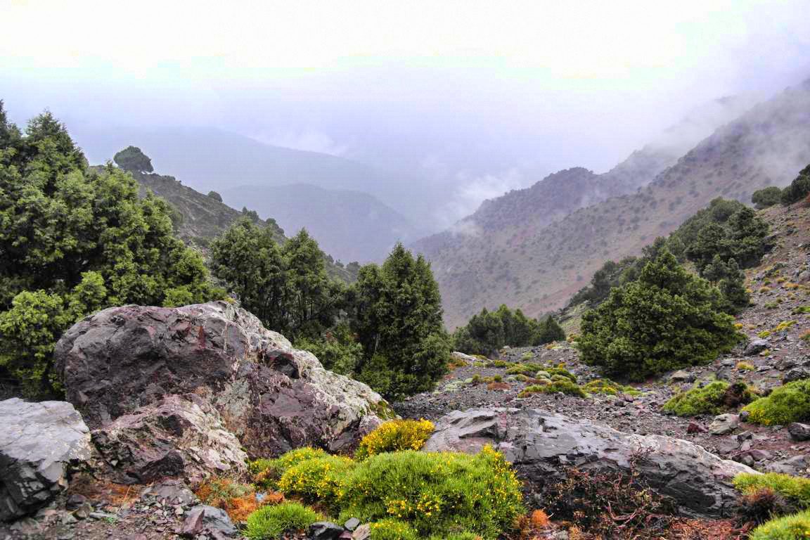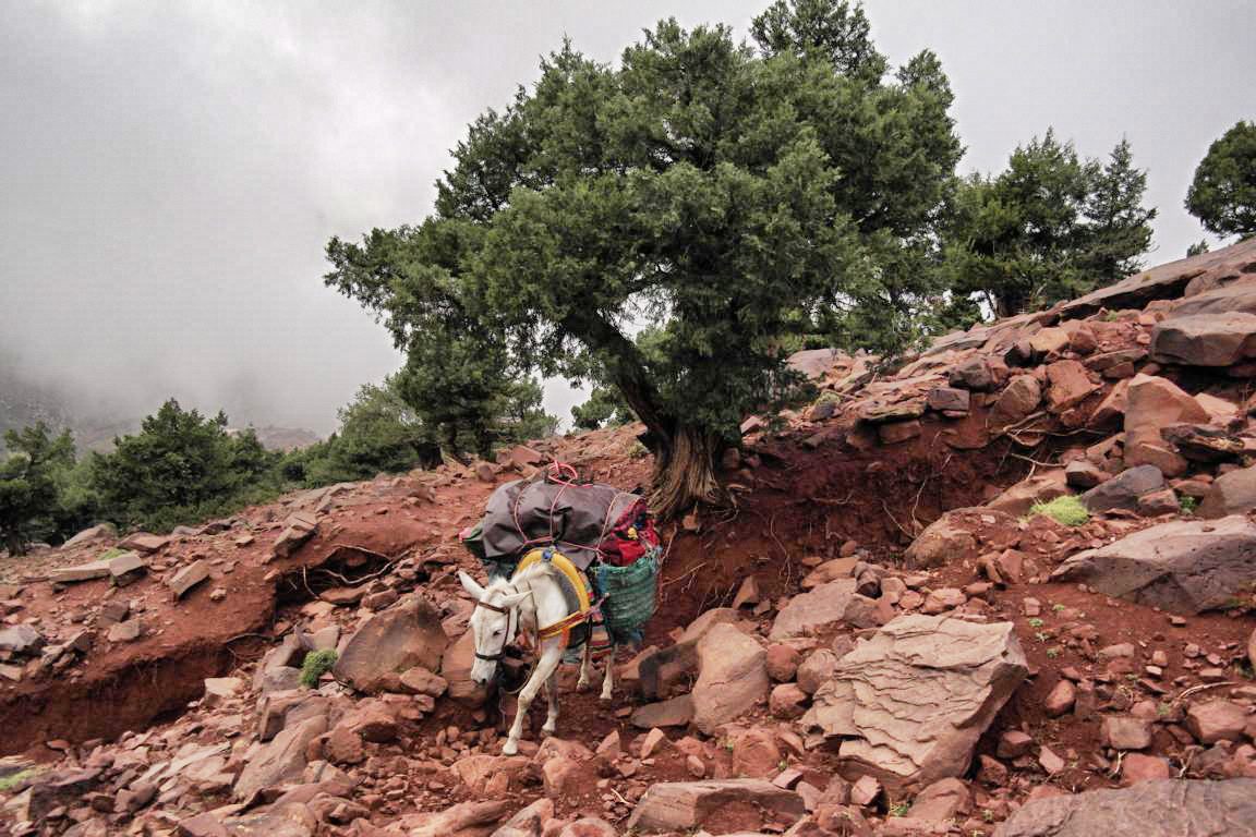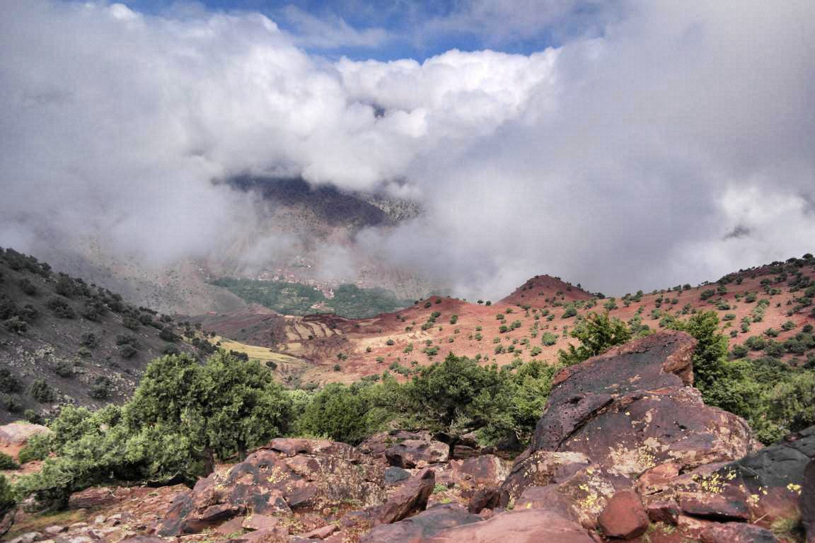 Eigentlich wäre auf dem Tizi Mzik Pass auch unser Lunchstop, doch aufgrund des Regens ist unser Maultierführer bereits zu unserem Tagesziel, Tizi Oussem Village, vorausgegangen. Wir machen uns auf den Abstieg, immer tiefer in die Nebelschwaden hinein. Der Regen stoppt.