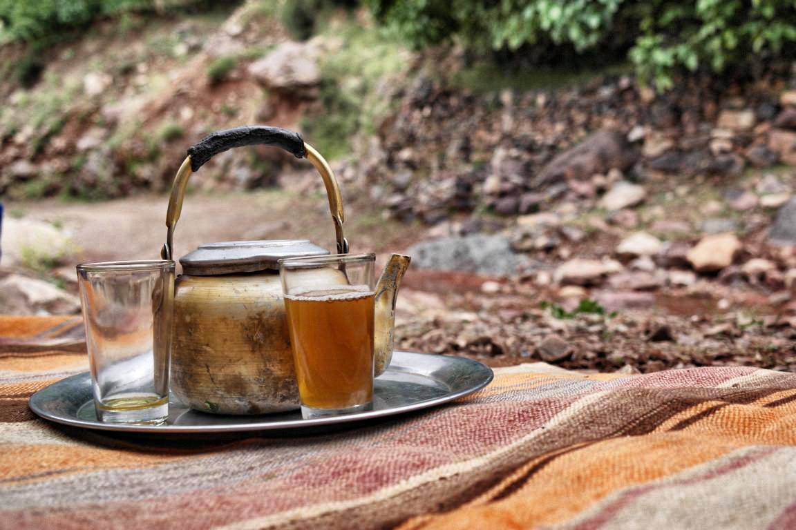 Ins Gespräch mit Brahim vertieft steigen wir immer höher und höher, bis wir Imlil schließlich hinter uns lassen und uns Richtung Tizi Mzik Pass wenden. Ab und zu kommt uns eine Gruppe Maultierführer mit schwer beladenen Maultieren entgegen. Langsam zieht Nebel auf. Ein leichter Sprühregen setzt ein. Und wir wandern höher und höher. Als wir schließlich den 2684 m hohen Tizi Mzik Pass erreichen erwartet uns zum Aufwärmen ein heißer marokkanischer Minztee – ich habe selten etwas so leckeres getrunken.