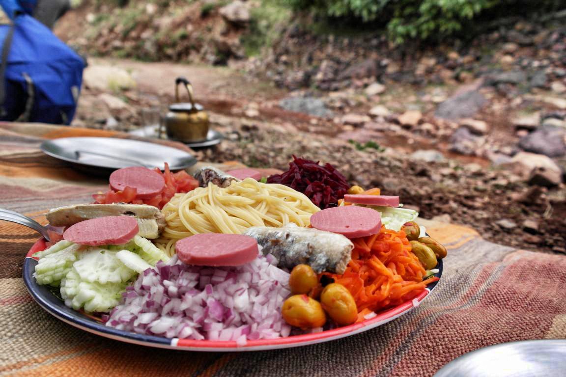 Schließlich kommen wir an unserem Picknickspot an. Dieser könnte idyllischer nicht sein: Direkt an einem plätschernden Bächlein, umgeben von Bergen und etwas abgeschirmt in einer Schlaufe des Weges gelegen. Unser Maultier schmatz bereits friedlich vor sich hin, aus den Gefäßen, die auf den beiden Campingkochern thronen dringen blubbernde Geräusche und eine bunte Decke liegt einladend für uns bereit. Wow, wir sind echt beeindruckt. Umso mehr, als wir wie am Vortag wieder eine köstliche Suppe und einen Salatteller mit Nudeln und Allerlei aufgetischt bekommen. Beschämt denke ich an die Mahlzeiten, die wir damals in Australien auf unserem Campingkocher zubereitet haben. Was für ein Festmahl! Und das mit einem Campingkocher. Hungrig lassen wir es uns schmecken. Zum Nachtisch gibt es frisches Obst und Minztee.