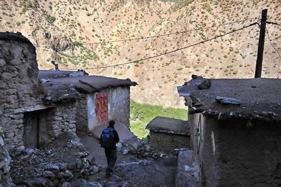 Nach einem schnellen Frühstück in unserem Riad geht es um halb 9 los: Brahim, unser netter und super englisch sprechender Bergführer holt uns ab und führt uns durch die noch leeren Strassen der Medina von Marrakech zu einem Geländewagen, in dessen Inneren der Fahrer ein genüssliches Schläfchen hält. Fahrer geweckt, Gepäck und Insassen im Wagen verstaut und ab geht die Fahrt in Richtung Atlasgebirge. Die Landschaft wird Stück für Stück immer bergiger, Dörfchen und Menschen, die mit allen vorstellbaren Arten von Bewegungsmittel unterwegs sind ziehen an uns vorbei, es wird merklich kälter, je höher wir kommen. 8 Grad zeigt das Thermometer als wir schließlich in Imlil aus dem Auto steigen. Ca. 15 Grad weniger als in Marrakesch. Freundlich werden wir vom Inhaber unserer Trekkingfirma begrüßt und bekommen erst einmal einen marokkanischem Pfefferminztee eingeschenkt. Lecker und super zum Aufwärmen. Dann werden Ruckzuck unsere Siebensachen auf ein bereitstehendes Maultier geschnürt und los geht es.