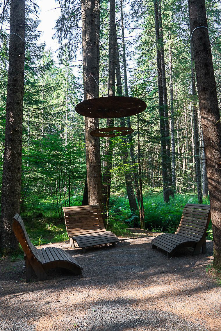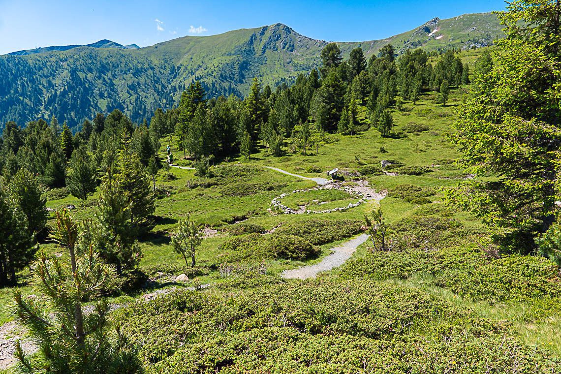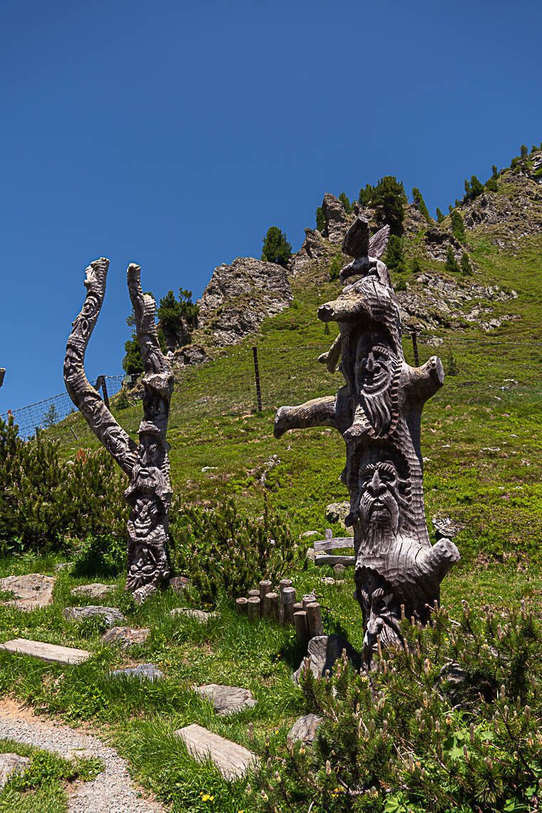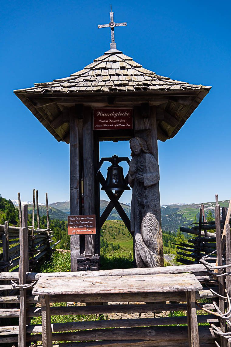 Auch wer keine Übungen macht, findet hier einen willkommenen ersten Einblick in die wunderschöne Landschaft der Nockberge. Der nächste Stopp ist der magische, von Zirben umgebene Windebensee, dessen Schönheit lediglich durch die Lage direkt an der Straße ein wenig vermindert wird. Ein kurzer, landschaftlich schöner Naturlehrweg führt in circa 20 Gehminuten rund um den See und veranschaulicht Wissen zu alpinen Lebensgemeinschaften auf Infotafeln. Der nächste Stopp ist die Glockenhütte auf der „Schiestlscharte“ auf 2.024 m, bei der man die Panoramaaussicht über die Nockalmstraße genießen und die Wunschglocke läuten sollte. Darüber hinaus gibt es hier noch eine naturkundliche Ausstellung des Biosphärenparks Nockberge, einen Bauernmarkt und ein Restaurant mit Sonnenterrasse, das bei Busreisenden und Motorradfahrern äußerst beliebt ist. Etwas enttäuscht waren wir vom nächsten Stopp, der „Silva Magica“ auf 1.688 m. Der Rundwanderweg zum eigentlich spannenden Thema Naturgeheimnisse und Naturwesen hatte keine wirkliche Linie und war ein verwirrender Mix aus Steinwissen, Kunst und einem Hauch Sagen.