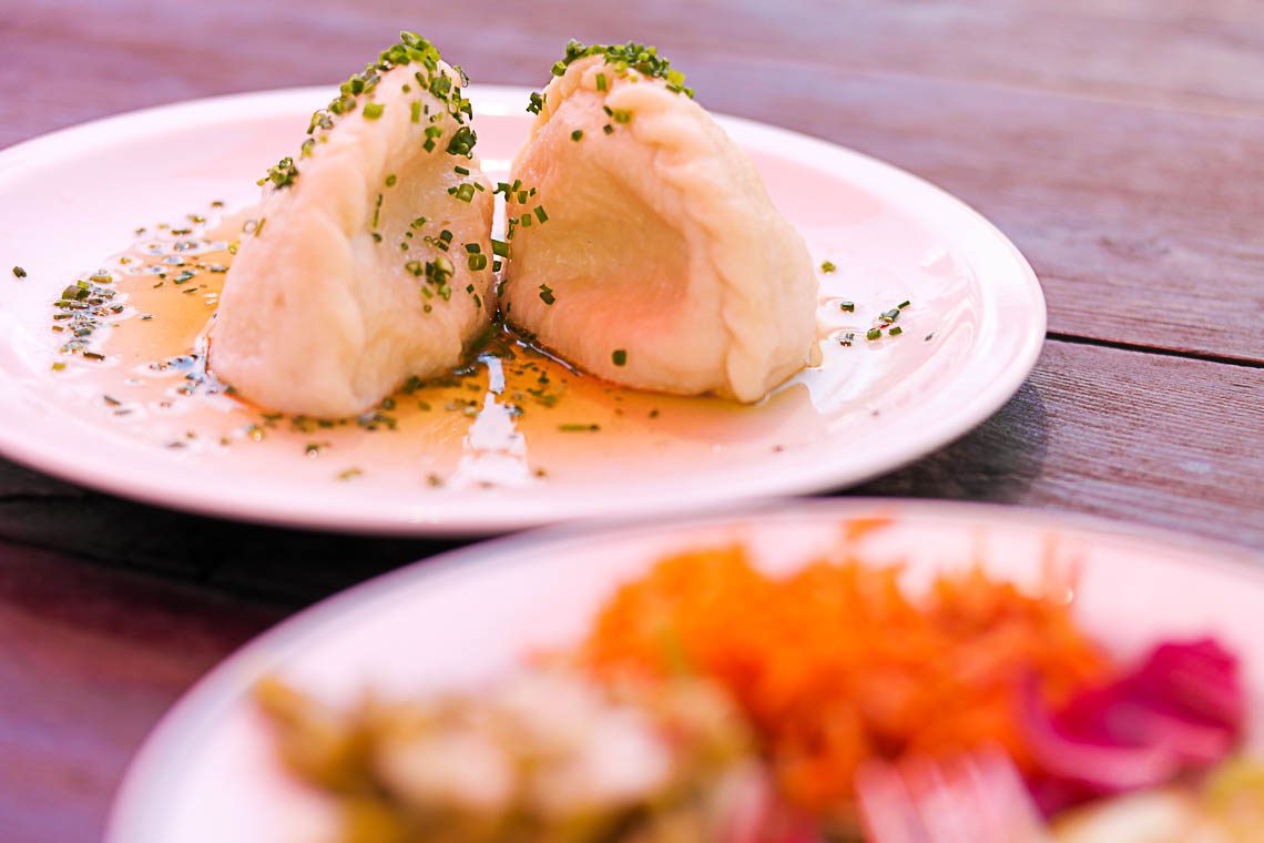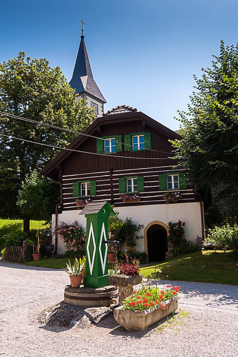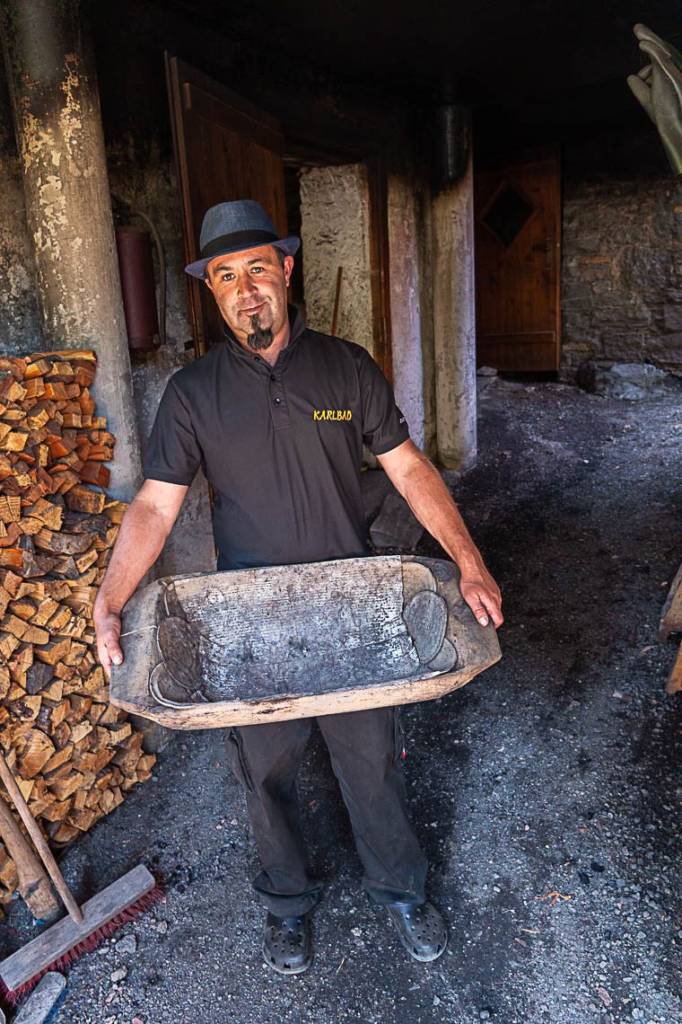 Anschließend ging es zum späten Mittagessen ins legendäre Karlbad. Hier gönnten wir uns eine Portion selbstgemachte Kärtner Kasnudeln zum Holunderschorle auf der Terrasse. Alternativ empfiehlt sich eine Jause mit Speck, Wurst und Käse aus eigener Produktion. Und zum Verdauen ein Schnaps. Richtig urig wurde es, als der Senior Chef für einige Lieder die Ziehharmonika auspackte und an den Tischen drauflos geschunkelt wurde. Auf dem Weg zur Toilette kann man noch einen Blick auf die Quelle des Karlbads werfen, welche sich im Haus selbst befindet. Wir hatten das Glück, den Junior Chef selbst zu treffen, der uns durch das Badehaus führte. Aber auch wer auf eigene Faust vor Ort ist kann ab 13 Uhr (nach der Badezeremonie) einen Blick zu den Badetrögen werfen. Diese befinden sich im Untergeschoss des Karlbads.