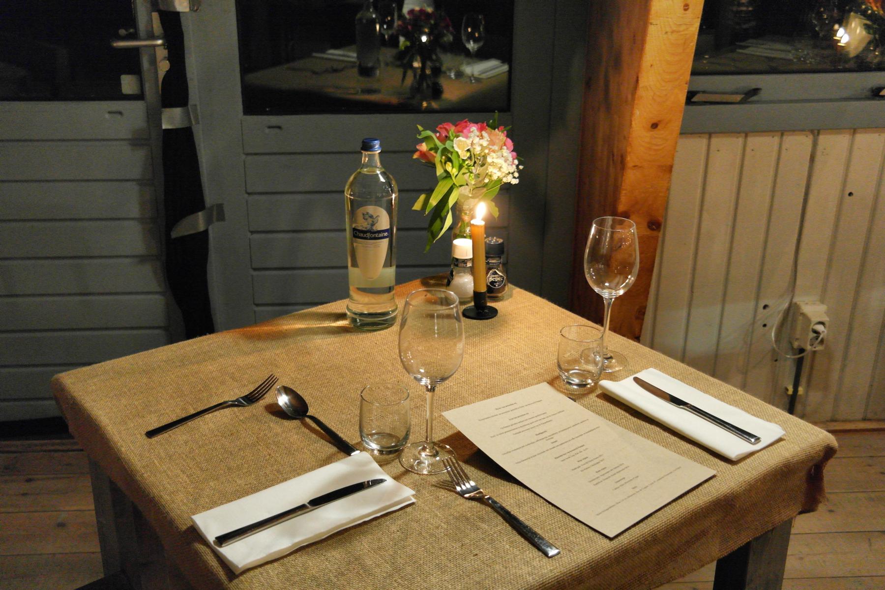 Wir lassen uns noch ein wenig im Wirrwarr der Gänge treiben bevor wir uns aus der Festung heraus zum am Ufer gelegenen Restaurant der Insel, “Paviljoen” genannt. Hier wird der Hauptgang und das Dessert serviert. Direkt am Fenster wird uns ein schlicht aber stilvoll gedeckter Tisch zugewiesen. Wir haben die Wahl aus vier verschiedenen erlesenen Weinen und einem Spezialbier der Brauerei Pampus (Anmerkung: die Brauerei musste im Jahr 2017 ihren Namen in Pontus Brewing umbenennen). Zum Dessert wird ein passender Dessertwein vorgeschlagen. Nachdem alle ihren Weg ins Restaurant gefunden haben wird der Hauptgang serviert: Kandierte Entenkeule mit Safranbirne, Sellerie- und Kastanienpüree, Kohl, Kohlrübe, Sprossen an einer Süßholzsoße, äußert kunstvoll auf einem Teller drapiert. Nicht nur ein Augenschmaus sondern auch ein kulinarischer Hochgenuss! Wir schweben im kulinarischen siebten Himmel!